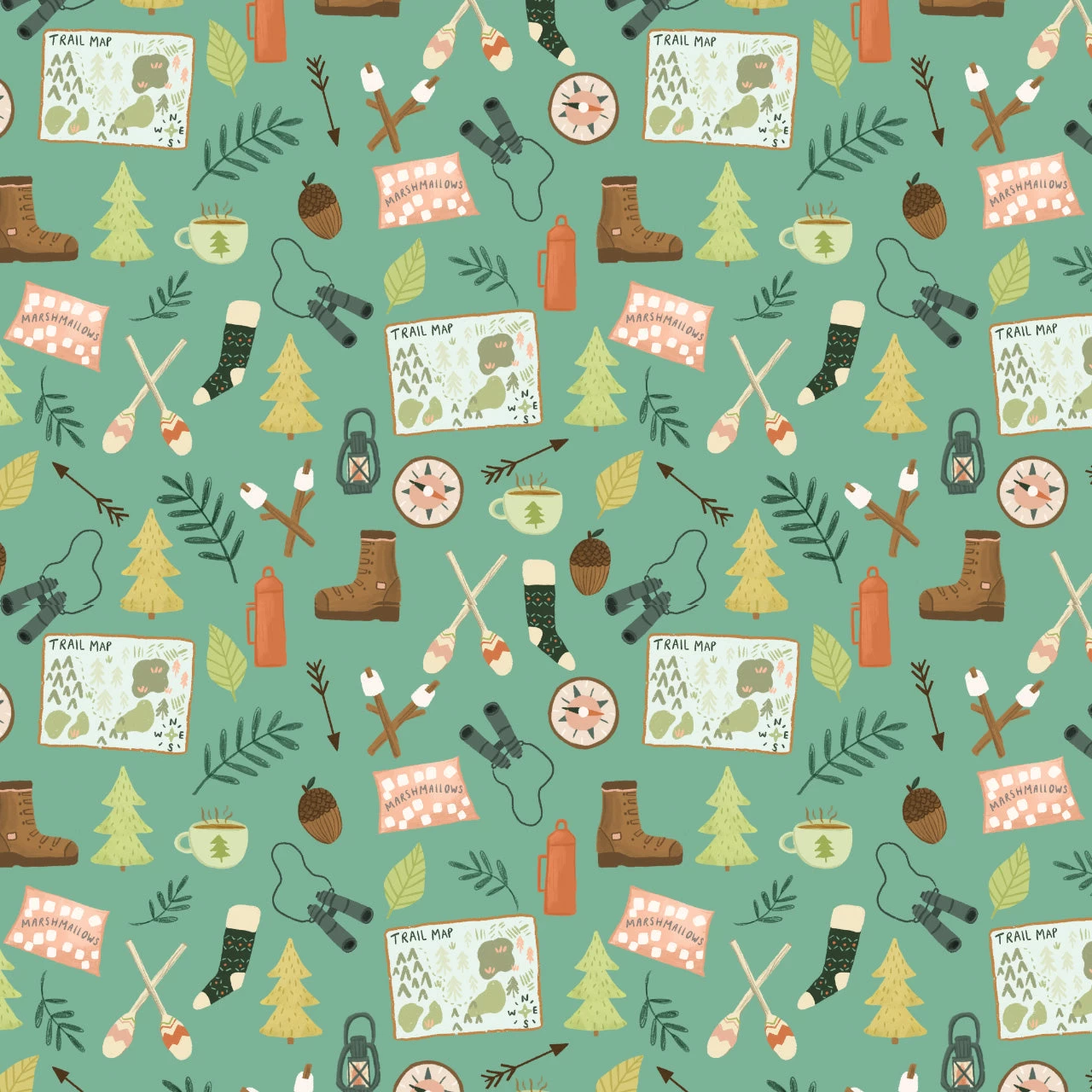 CEDAR2369 Camping motif fabric in blue from the Cedar Camp collection by Ramble & Bramble for Dashwood Studio.