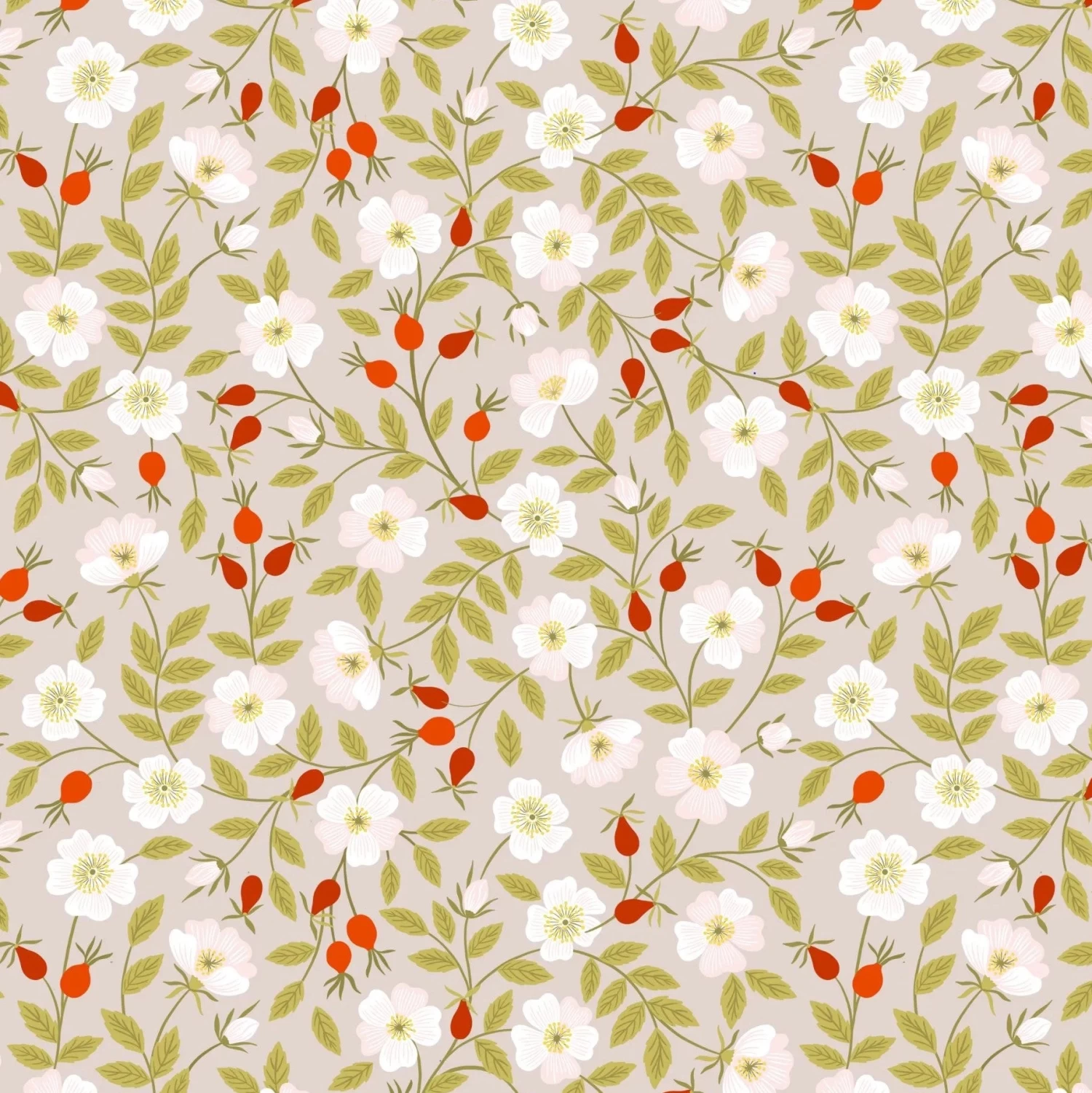Dog Rose on cream fabric from the Evergreen collection from Lewis & Irene.