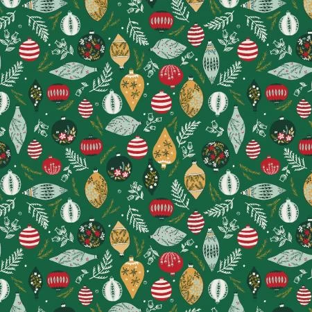 Deck the Trees metallic fabric in mistletoe from the Merry Memories collection by Yuan Xu for RJR Fabrics.