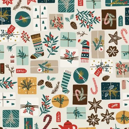 Opening Presents metallic fabric in ivory from the Merry Memories collection by Yuan Xu for RJR Fabrics.