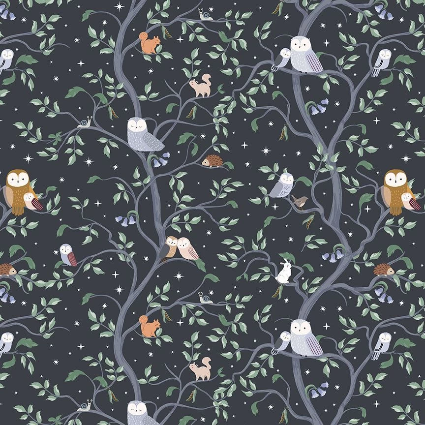Owl You Need is Love fabric in charcoal from Owl You Need is Love collection from Dear Stella. A charcoal grey fabric featuring owls, squirrels, rabbits, and hedgehogs.