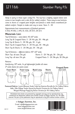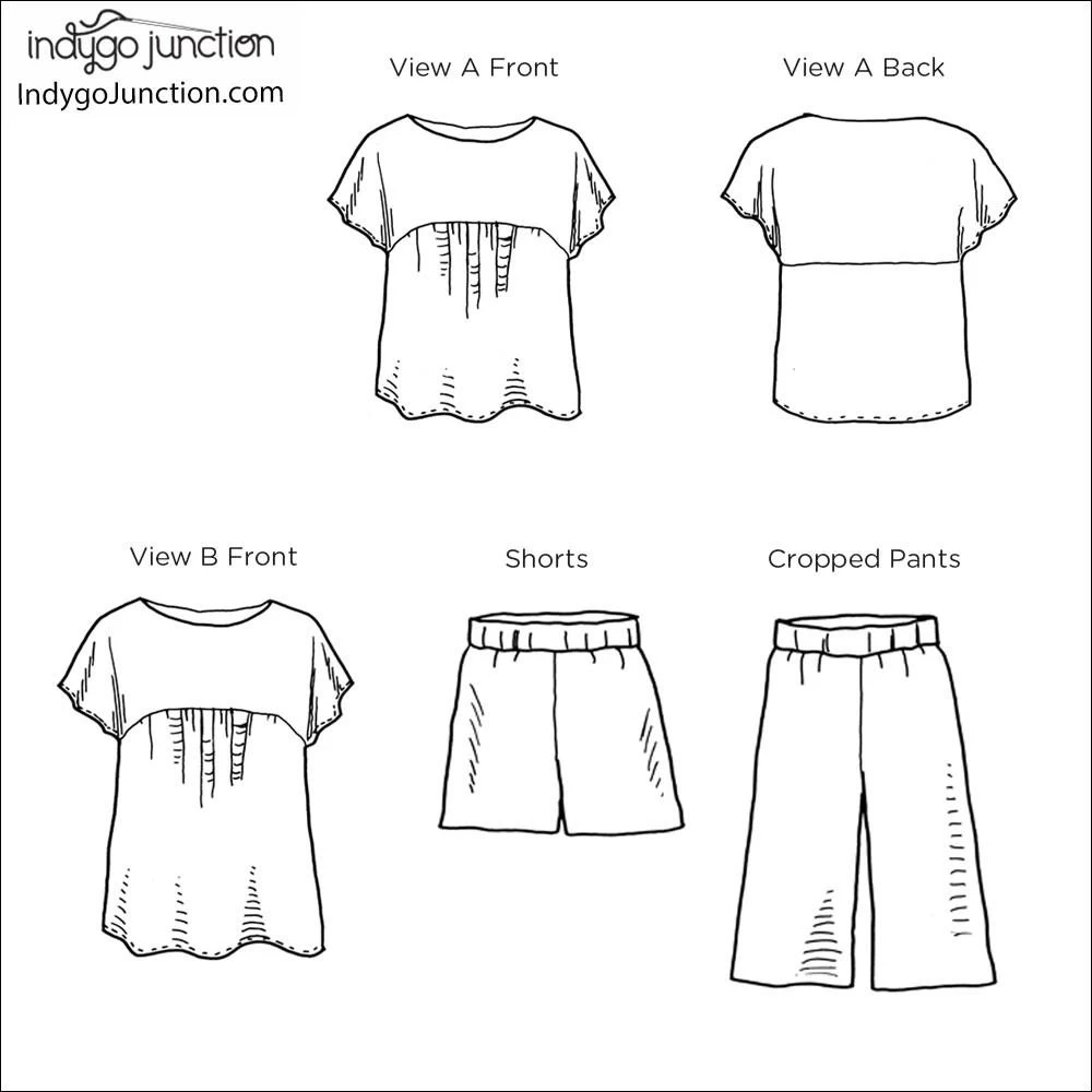 Sleep or party in these super comfy PJs. The top has a slightly capped sleeve and comes in two lengths and a side slit for added comfort. These easy-to-sew bottoms come in shorts or cropped pant lengths and feature a wide elastic waistband for added comfort. Simple to make and cozy to wear.