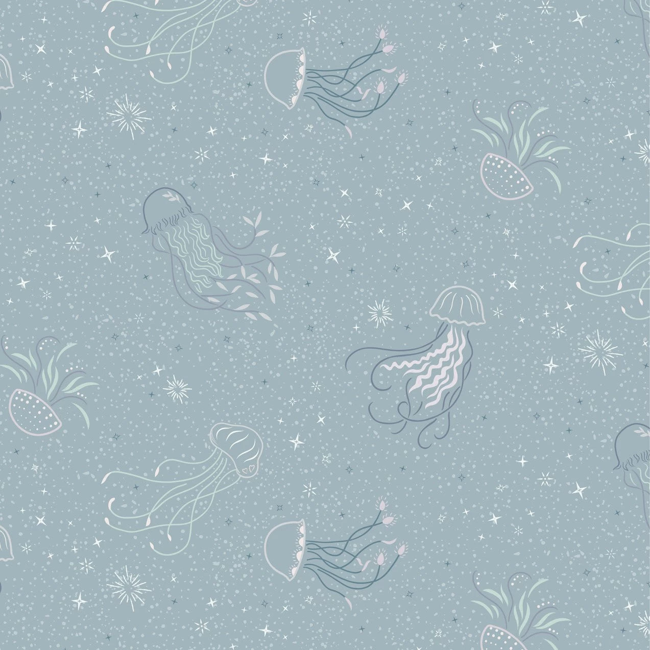 Jellyfish Dance fabric on dusky turquoise from the Sound of the Sea collection by Cassandra Connolly from Lewis & Irene.